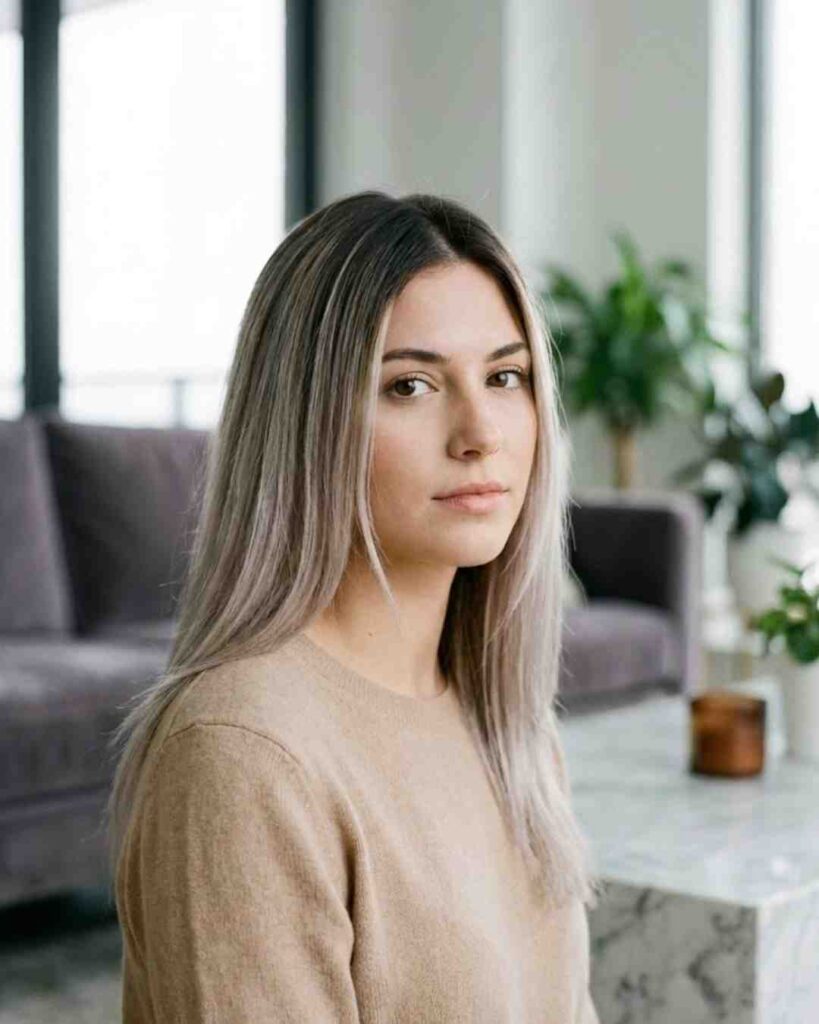 Ash frost brings the drama—but in a refined, grown-up way. These highlights lean cool, smoky, and crisp, and they’ve taken over winter hair Pinterest boards for a reason.