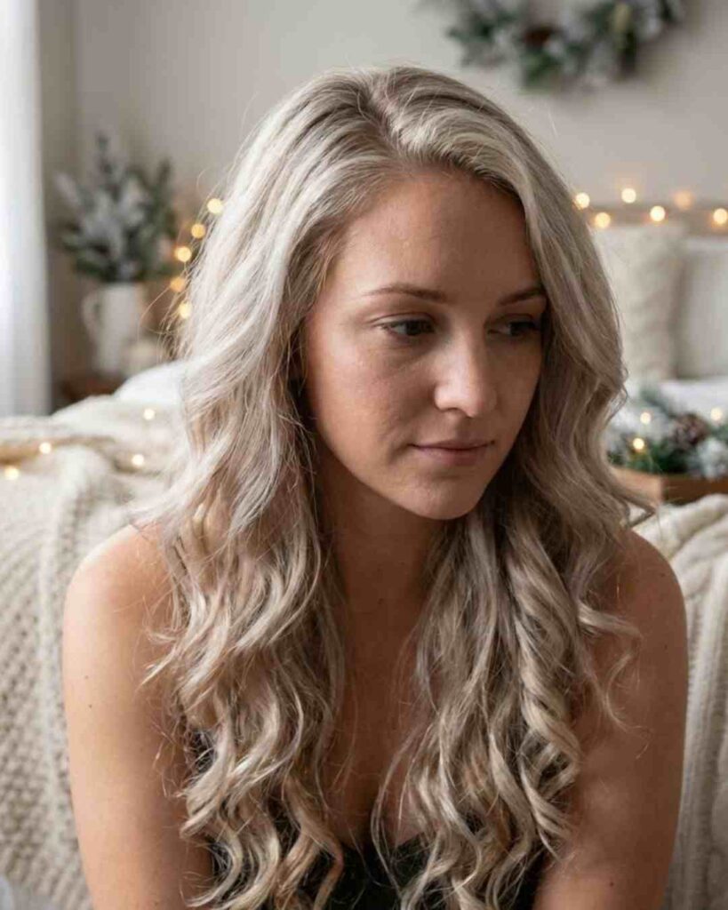 Winter lighting loves cool tones. Streetlights, holiday décor, and even cloudy skies make frosted blonde shine. That’s honestly why I return to it every year—it photographs beautifully, and it feels seasonal without being over-the-top.