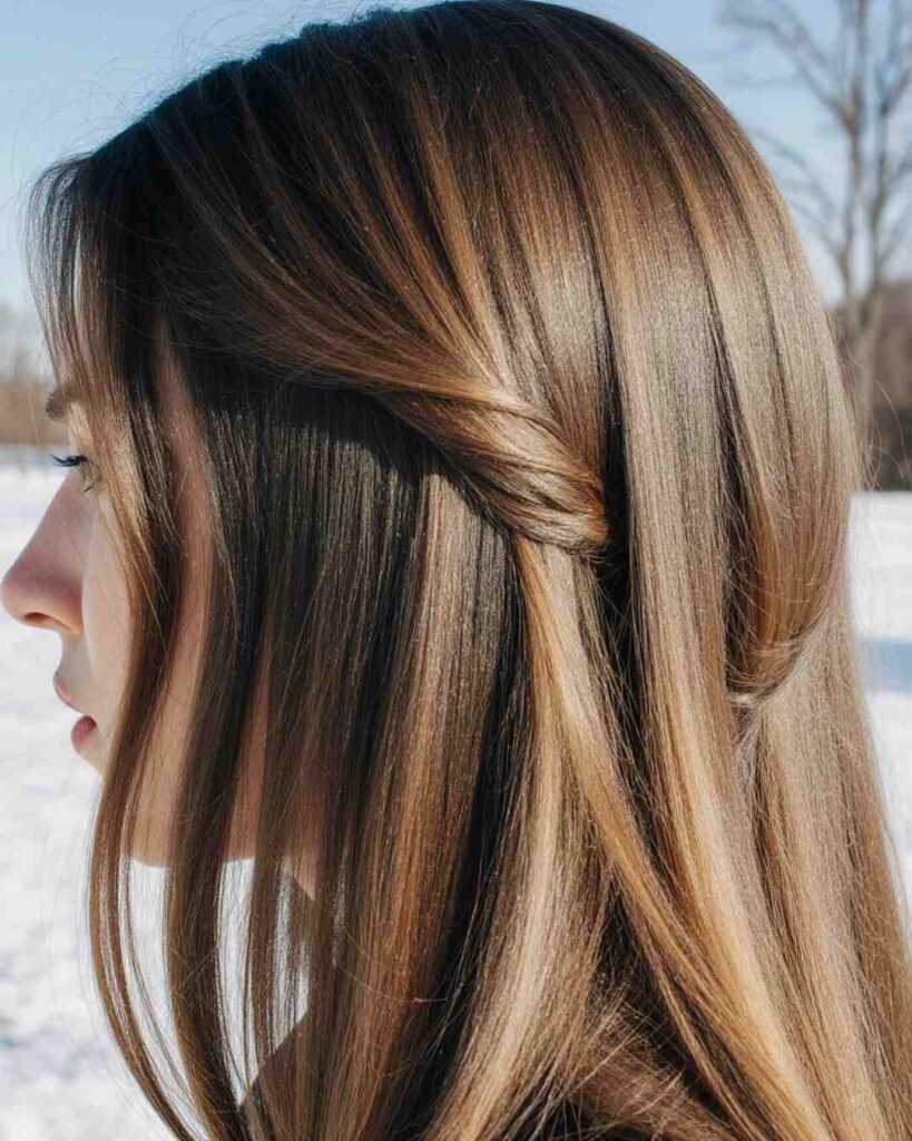 When I want sleek, simple, and stylish, I pull out the straightener. A polished straight look brings out shine, especially with winter’s crisp lighting.
