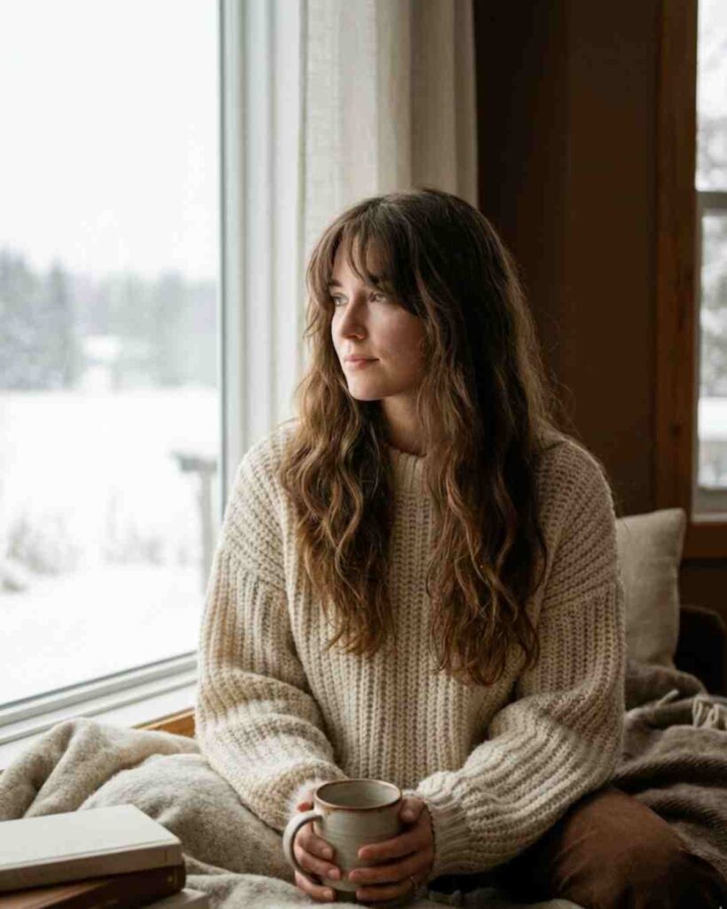 Chunky knits, oversized scarves, wool coats… long hair with bangs balances all that bulk. Without face-framing pieces, winter layers can swallow your features. Bangs fix that instantly.
