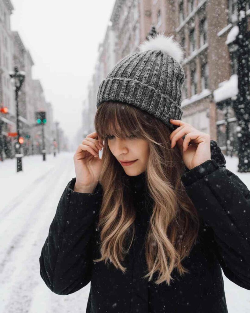 Curtain bangs never disappoint in cold weather. They soften your look, move naturally, and still look cute even if a little wind gets involved.