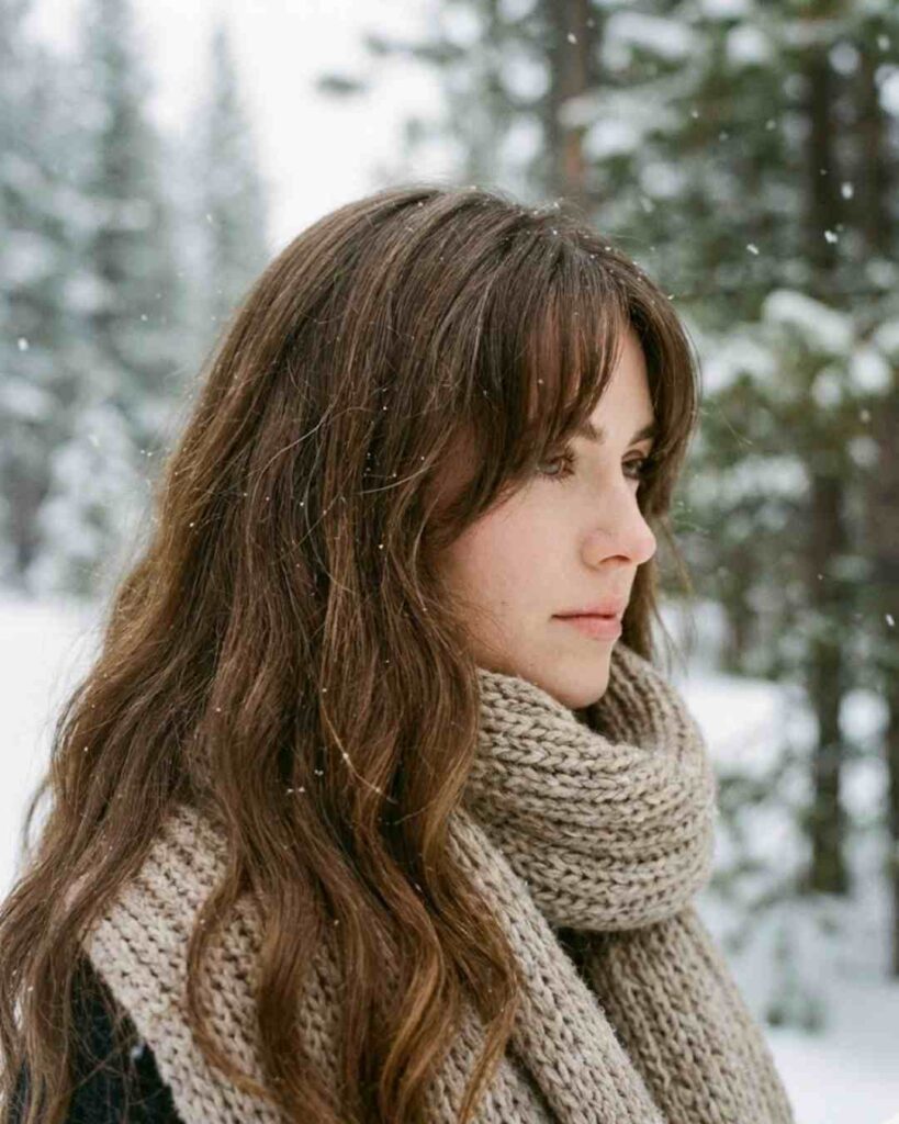 Wispy bangs look dreamy in winter lighting. Seriously, the softness just hits different when the sun is low and the air is crisp.