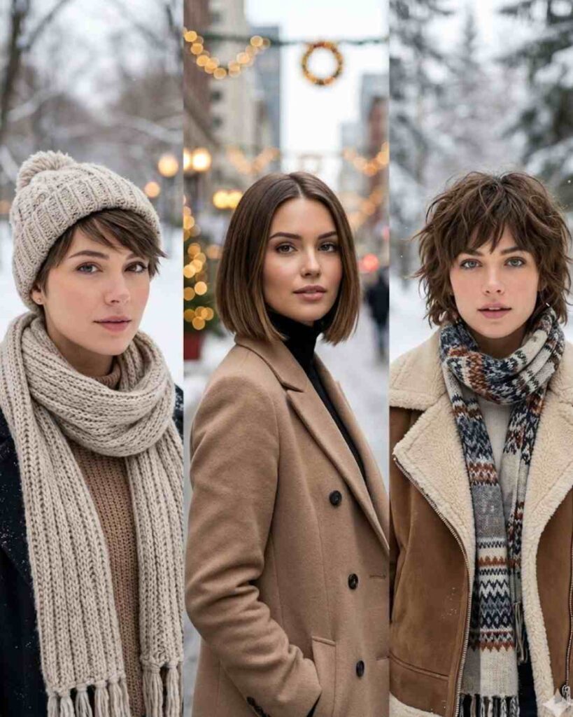 Thick scarves highlight short cuts and create contrast that feels modern and stylish.